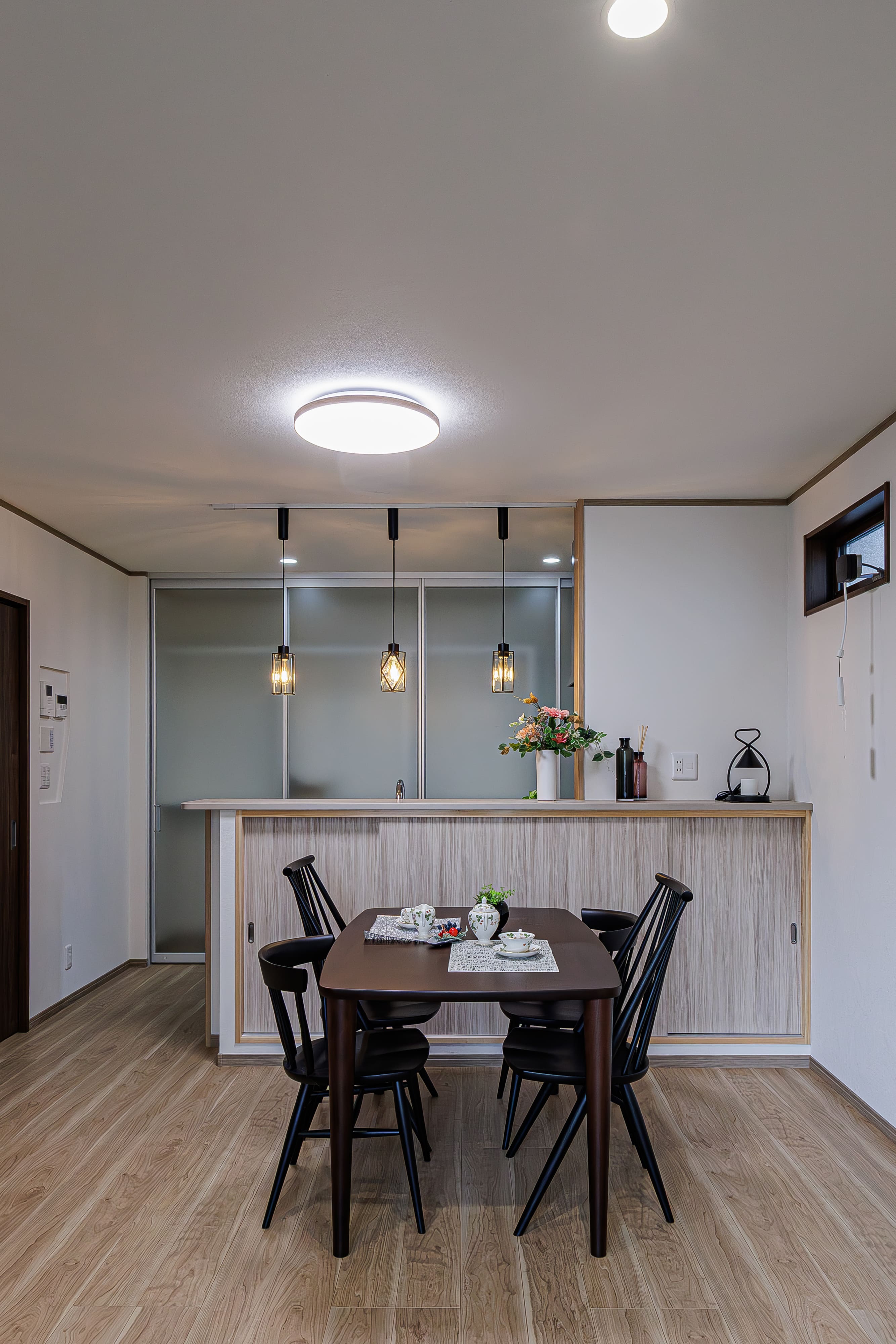 毎日の暮らしが心地よくなるよう、動線と収納にこだわったお住まいです。 リビングからそのまま寝室へつながる間取りで移動のしやすさを実現。 洗面スペースはキャビネットタイプを採用し見せる収納としてすっきりした印象に仕上げました。 キッチンは背面には扉を設けることで、冷蔵庫やカップボード、家電類を隠せる工夫を。急な来客時でも生活感を見せず、すっきりした空間を保てます。 飽きのこないシンプルさと、使いやすさを大切にした住まいです。