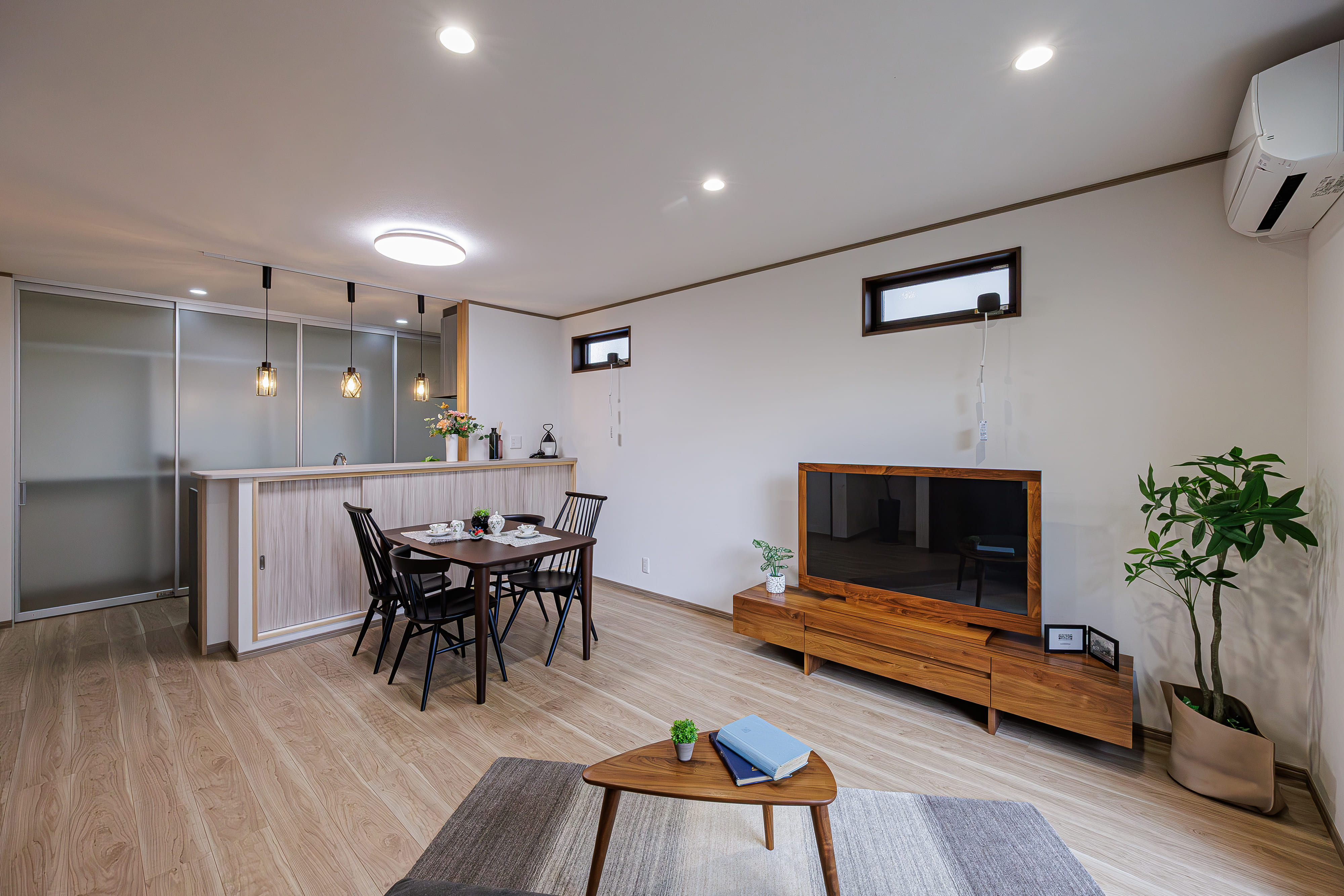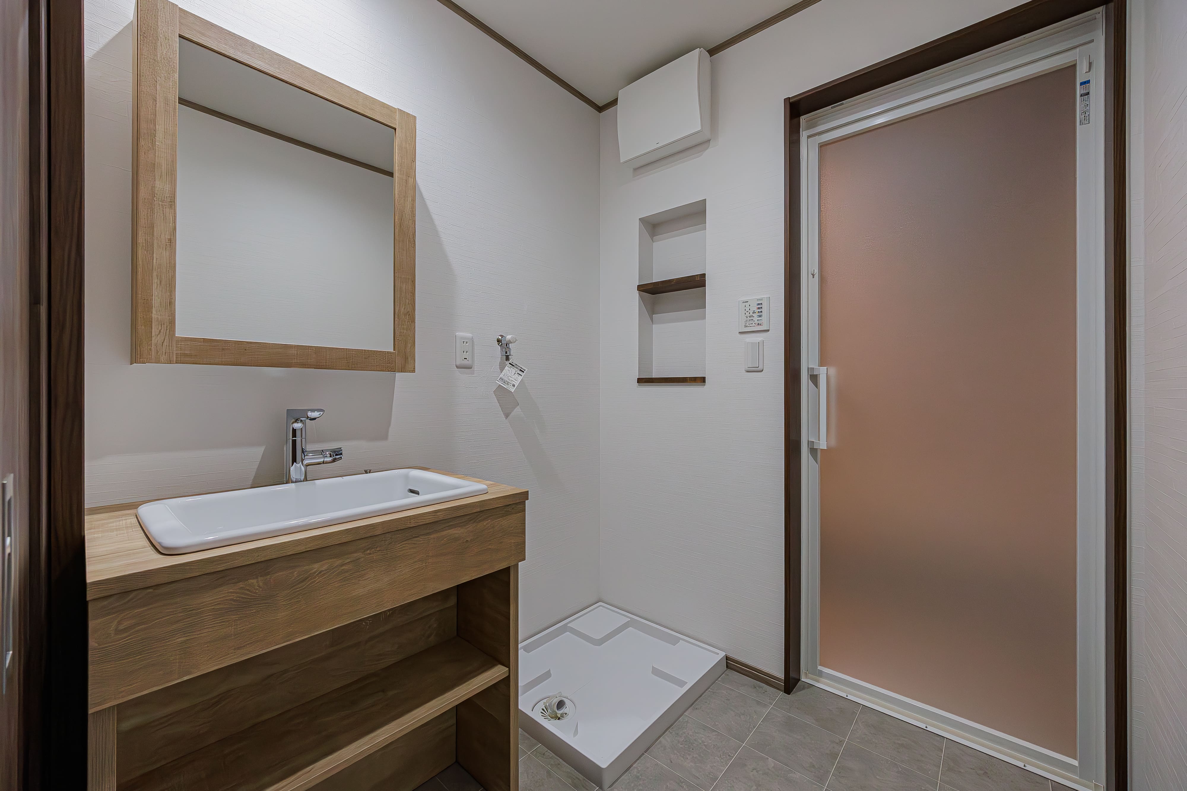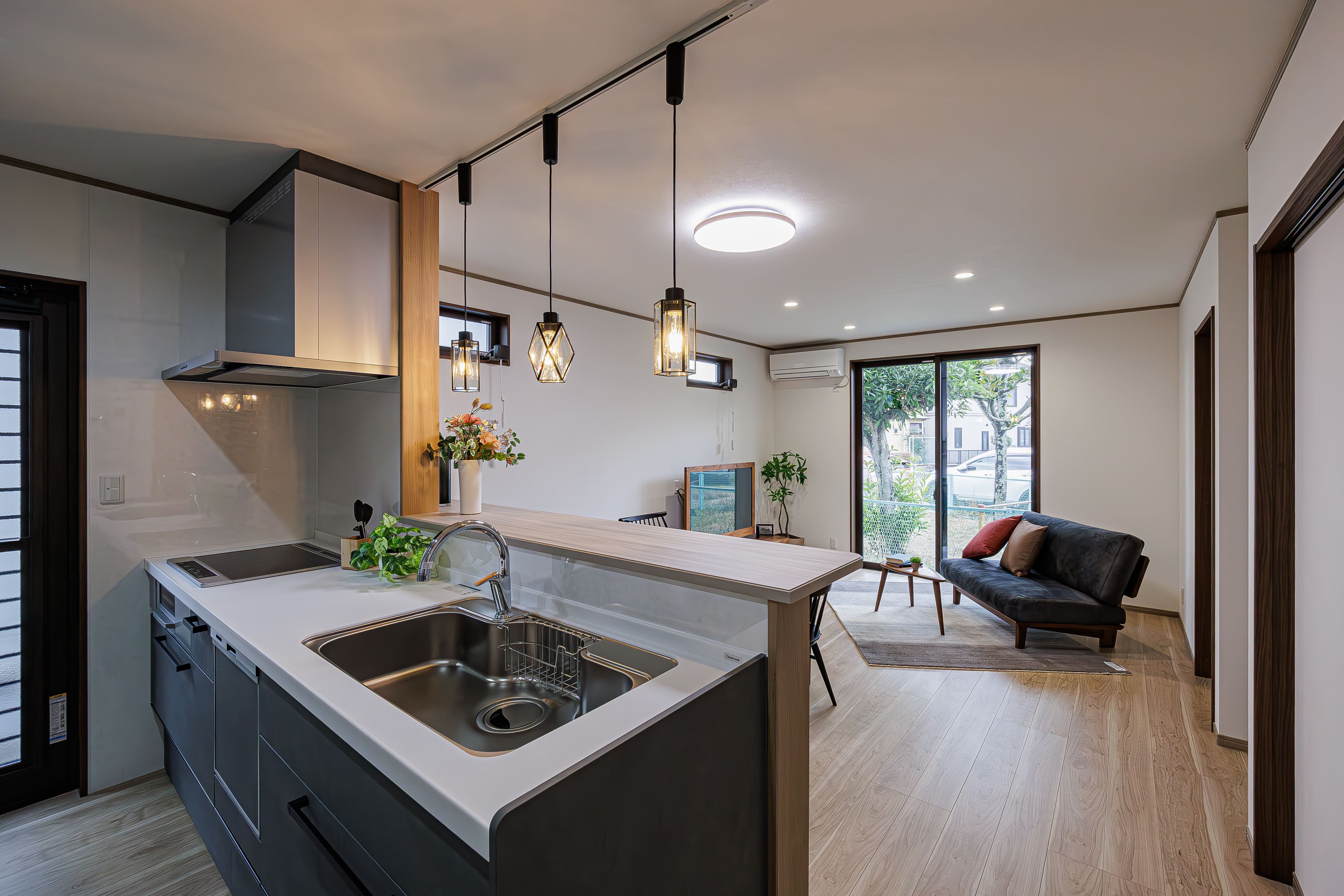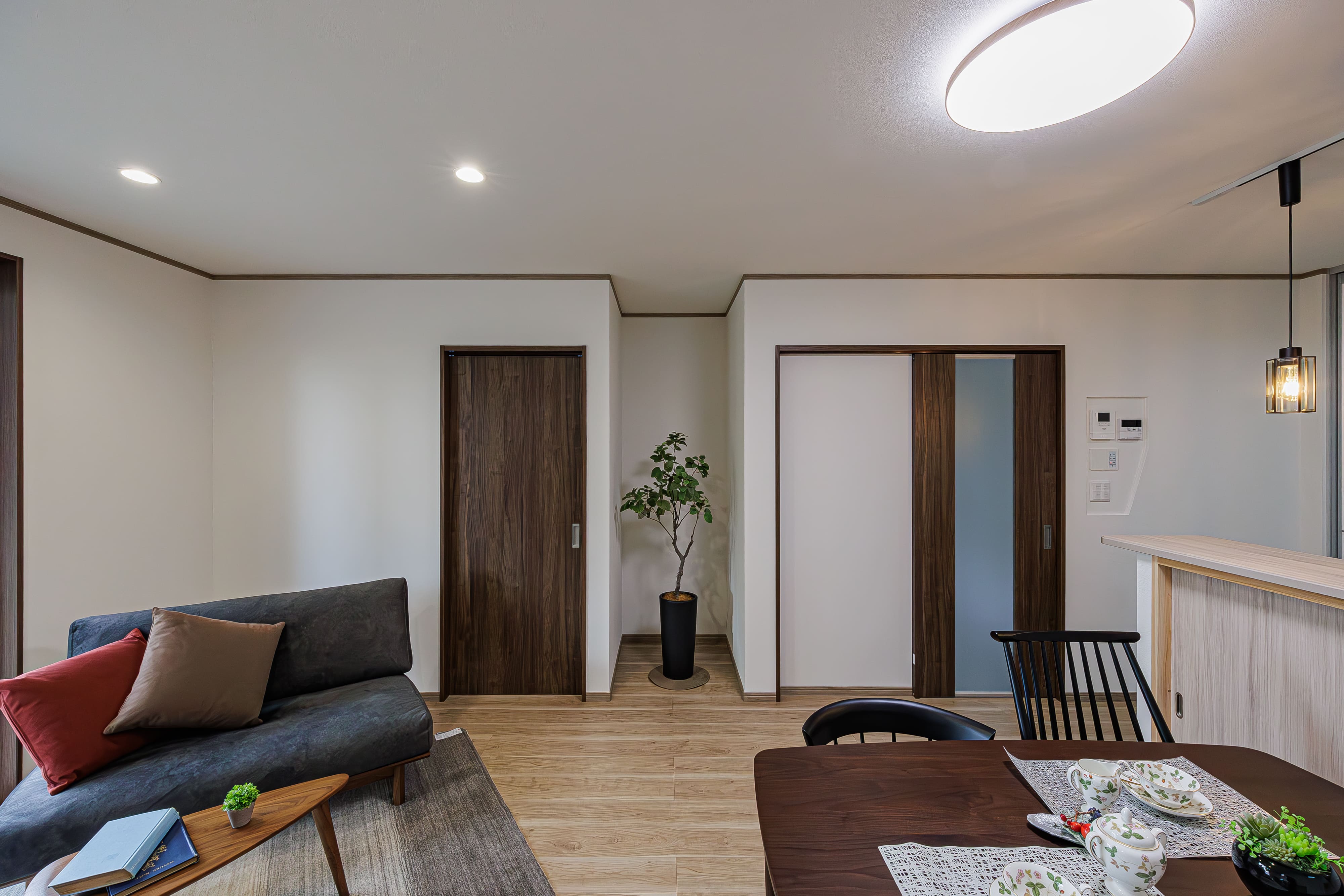 毎日の暮らしが心地よくなるよう、動線と収納にこだわったお住まいです。 リビングからそのまま寝室へつながる間取りで移動のしやすさを実現。 洗面スペースはキャビネットタイプを採用し見せる収納としてすっきりした印象に仕上げました。 キッチンは背面には扉を設けることで、冷蔵庫やカップボード、家電類を隠せる工夫を。急な来客時でも生活感を見せず、すっきりした空間を保てます。 飽きのこないシンプルさと、使いやすさを大切にした住まいです。