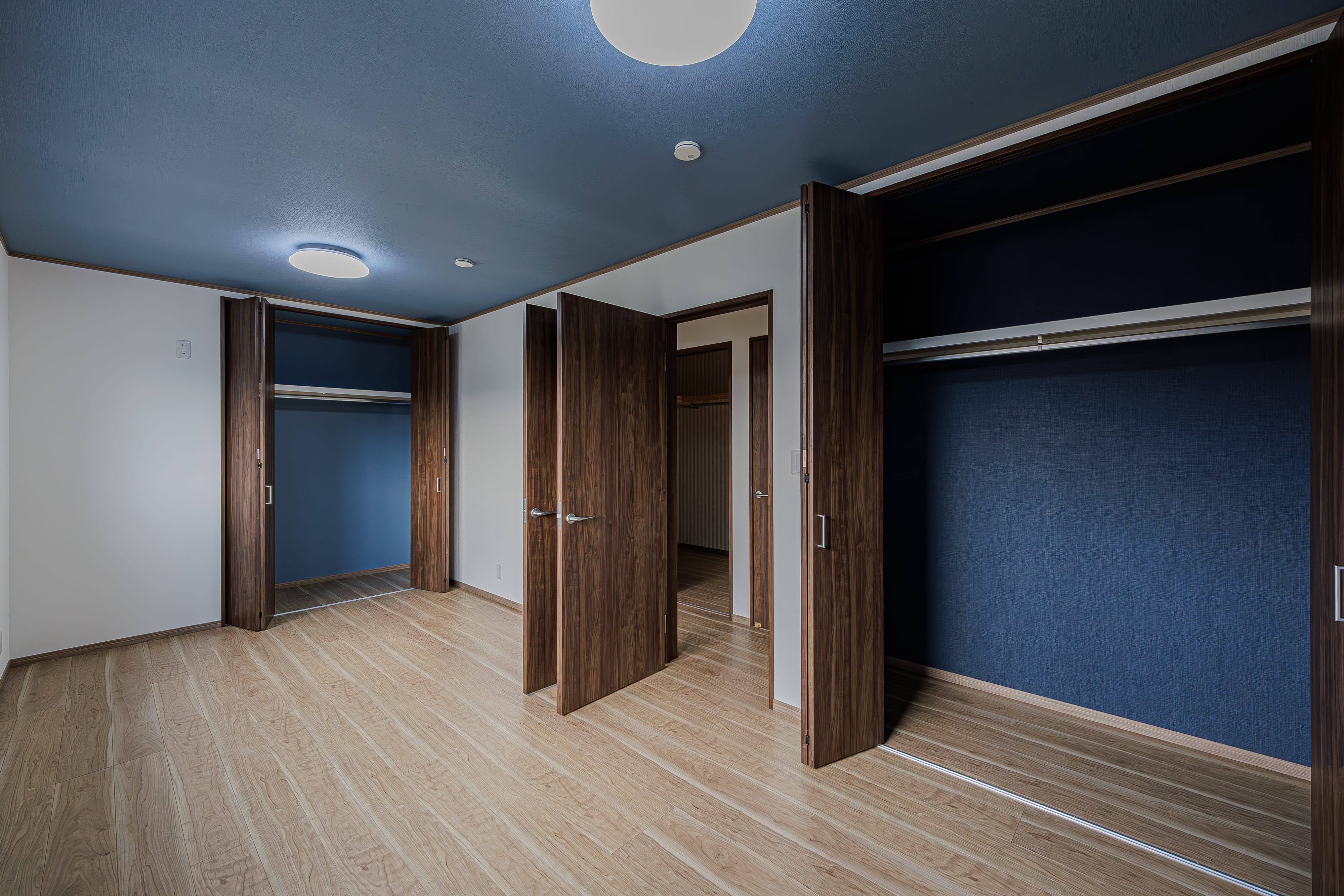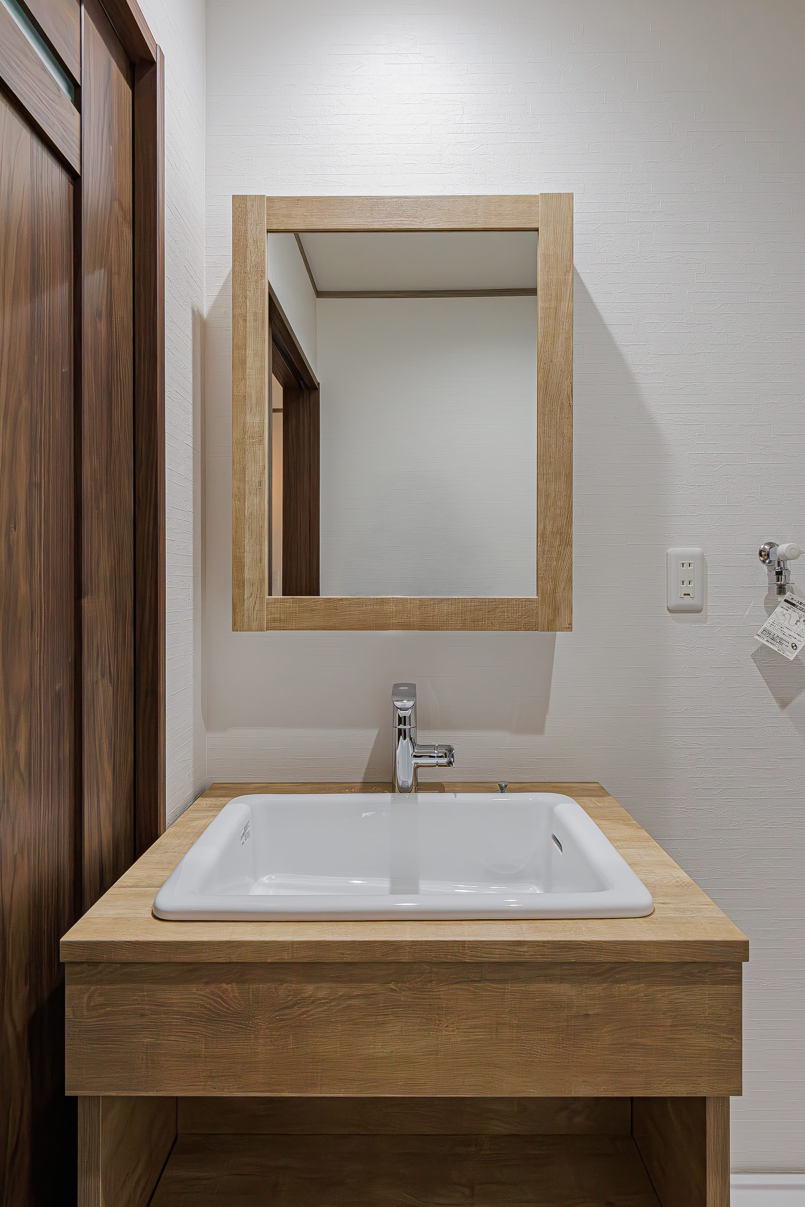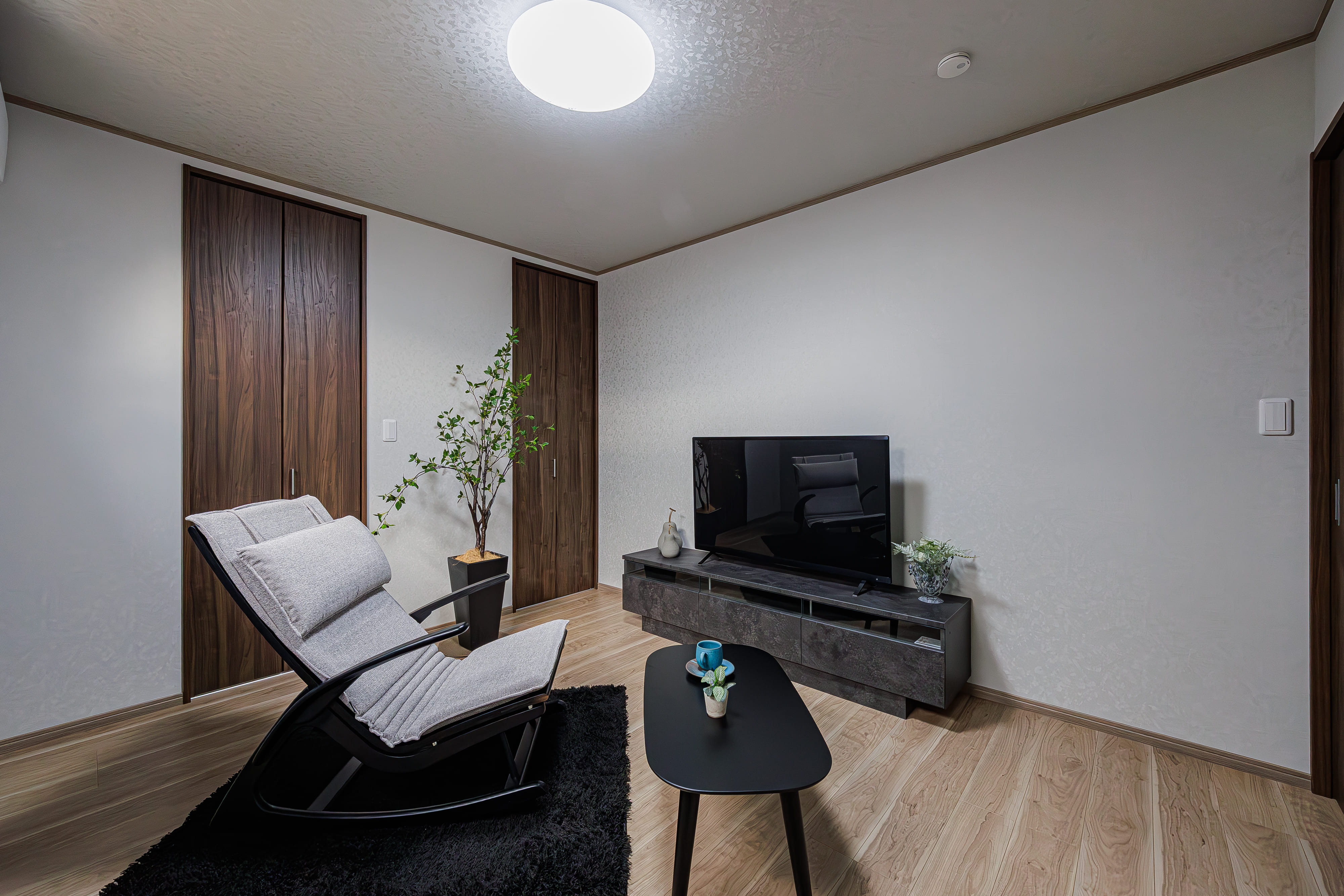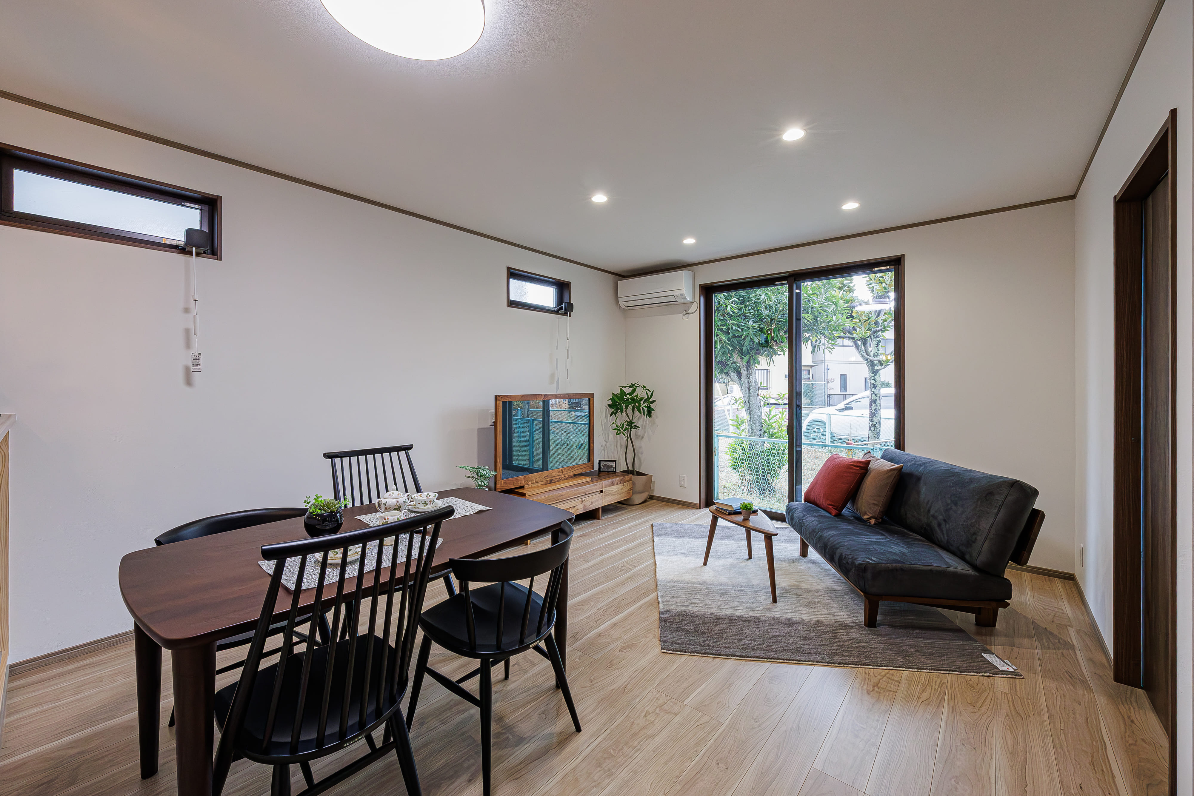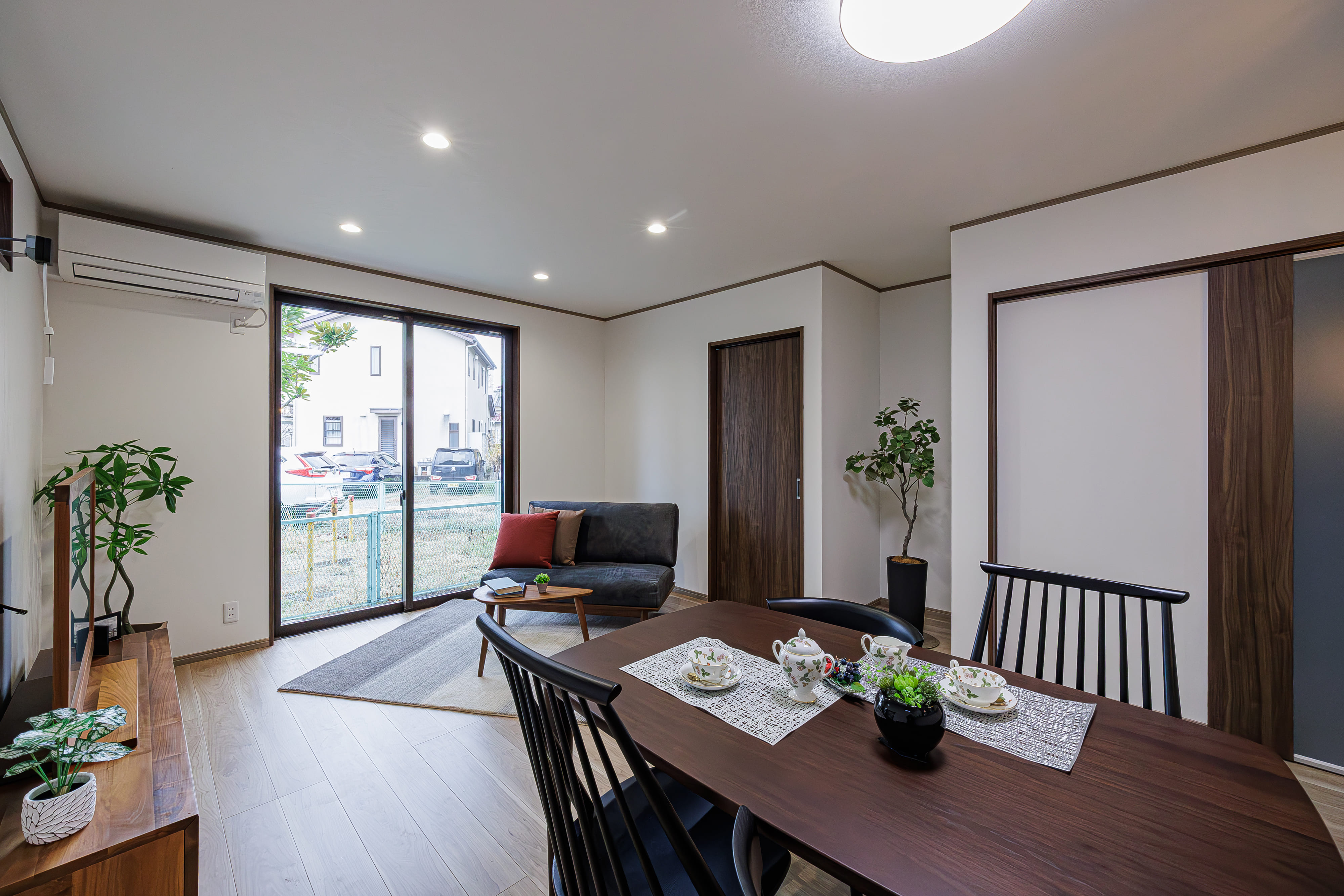 毎日の暮らしが心地よくなるよう、動線と収納にこだわったお住まいです。 リビングからそのまま寝室へつながる間取りで移動のしやすさを実現。 洗面スペースはキャビネットタイプを採用し見せる収納としてすっきりした印象に仕上げました。 キッチンは背面には扉を設けることで、冷蔵庫やカップボード、家電類を隠せる工夫を。急な来客時でも生活感を見せず、すっきりした空間を保てます。 飽きのこないシンプルさと、使いやすさを大切にした住まいです。